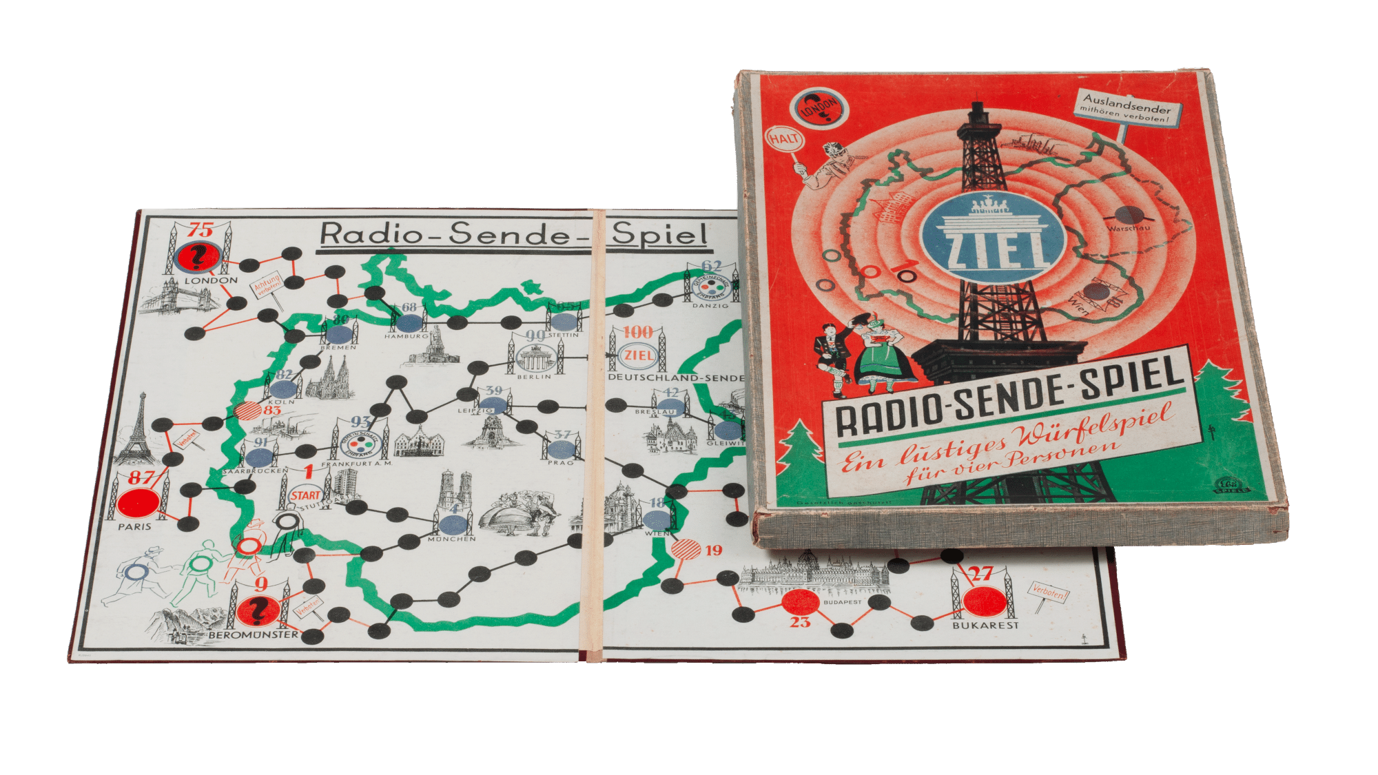Mit der Verordnung über außerordentliche Rundfunkmaßnahmen drohte ab 1. September 1939 auf das Hören ausländischer Sender Gefängnis oder Zuchthaus. Bei Verbreitung des Gehörten konnte sogar die Todesstrafe folgen. Entsprechende Warnschilder der NSDAP sollten an allen Radios befestigt werden. In Form des „Radio-Sende-Spiels“ erreichte die Botschaft auch Kinder und Jugendliche. Wer auf ein „Ausslandssender-Feld“ kam, musste laut Anleitung einen Pfennig zahlen und neu anfangen.